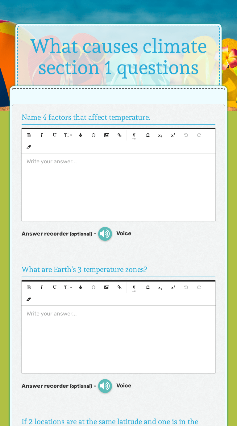 Many marine climates are also influenced by ocean currents. Factors affecting weather and climate. Choose an answer and hit 'next'. You will receive your score and answers at the end. Normally, climatic conditions become colder as altitude increases. There are six major natural climate factors: Factors affecting weather and climate. Name the 4 main factors that affect temperatures in a region. Describe the differences between victoria's monthly average temperature and tokyo's monthly . Study the two charts above and answer the following questions. What does eccentricity refer to . Students will develop hypotheses about how factors influence climate and will. Why are climates located farther from the equator cooler than .